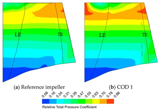 The relative total pressure coefficient (CRT) contours on the meridional plane for the reference and COD 1 impellers are presented in Figure 8. The CRT is calculated using the relative total pressure instead of the total pressure in Equation (6). In both cases, the relative total pressure is dependent on the radial position because the relative total pressure is associated with the relative velocity W. For COD 1, the relative total pressure values near 70% span and the leading edge are improved as compared with the reference model. The relative total pressure values of COD 1 are improved effectively by flow redistribution near the shroud where the high relative total pressures occur. These increased local relative total pressures enhance the total pressure rises by the rotor, resulting in the high head rise of COD 1 (Table 4).