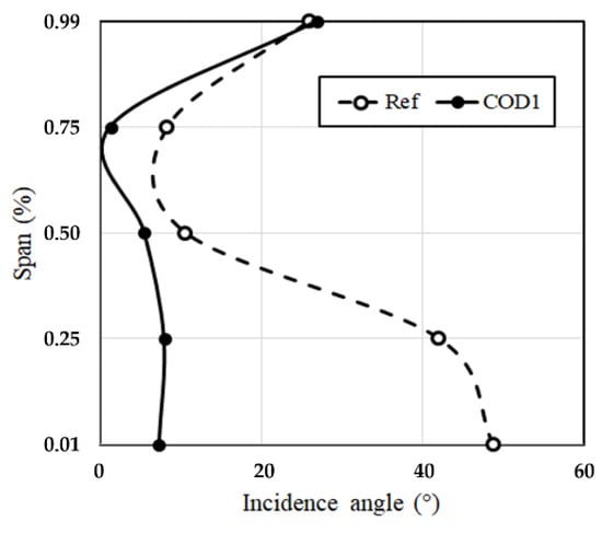 Comparison of incidence angles of the diffuser for the reference and COD 1 impellers.