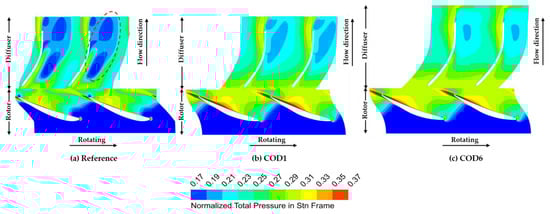 Figure 13 presents the total pressure coefficient contours at 50% span of the impeller and the diffuser for the reference design, COD 1, and COD 6. In the case of the reference design, the low total pressure region is widely spread in the passages of the diffuser. These regions are improved through the multi-objective optimization of the swept impeller, as shown in Figure 13b. It is noticeable that the flow downstream of the impeller affects the flow field of the diffuser, and the flow passage of the diffuser is also improved through the design optimization. COD 6 shows further improvement of the total pressure in the passage of the diffuser. However, the high total pressure region observed near the trailing edge of the diffuser is slightly diminished for COD 6.