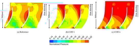 The pressure coefficient contours at 50% span of the diffuser for the reference design, COD 1 and COD 6, are presented in Figure 14. The pressure coefficient is defined by using the static pressure instead of the total pressure in Equation (6). For the reference design, the pressure is increased along the pressure surface of the diffuser vanes and decreased from the 80% chord of the diffuser vanes. This decreasing pressure is improved for COD 1 as a result of optimization of the swept impeller. In addition, through the design optimization of the diffuser, the pressure distribution in the passages of the diffuser gradually increases from the leading edge to the trailing edge of the diffuser vane for COD 6.