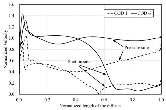 Figure 15 presents the comparison between the velocity distributions of CODs 1 and 6 at 50% span of the diffuser vane. The velocity is normalized by the velocity averaged at the inlet of each diffuser. The velocity distributions of COD 6 show generally larger values than those of COD 1. The velocities along the suction side of the diffuser vane of COD 6 decrease drastically from 40% normalized length, and have lower values than those of COD 1 from 65% normalized length. However, near the trailing edge of the diffuser, the normalized velocity of COD 6 becomes similar to that of COD 1. This decrease in the velocity for COD 6 is due to the recovery of the static pressure. The sufficient recovery of the static pressure in COD 6 results in higher total pressure than that in COD 1. On the pressure side of COD 6, the velocity remains nearly constant as the velocity averaged at the inlet.