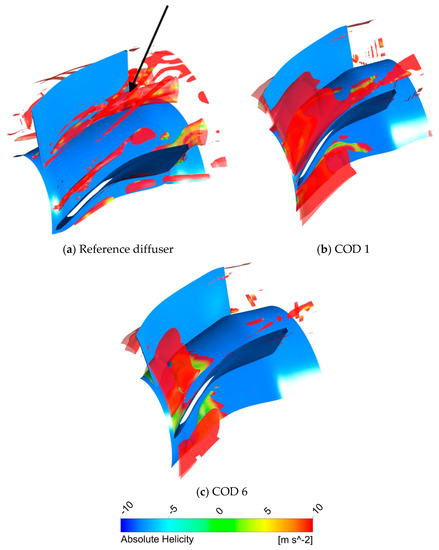 In order to analyze the three-dimensional flow structure near the diffuser, the absolute helicity contours on the isosurface of the vorticity of 22 s−1 are compared among the reference, COD 1, and COD 6, as shown in Figure 16. In the case of the reference diffuser, the vorticity increases along the streamwise direction, as shown in Figure 16a. Although CODs 1 and 6 have these vorticity regions at the inlet, they decrease as the flow proceeds. In particular, COD 6 has a relatively small vorticity region at the inlet of the diffuser. These phenomena can explain the total pressure contours, also shown in Figure 13.