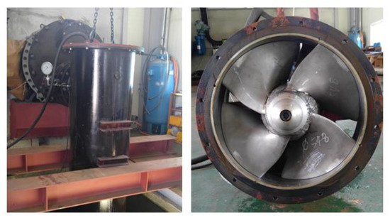 The hydrodynamic performance characteristics of the pump prototype model were measured following the KS B 6320 standard [] in the current study. A schematic diagram of the experimental setup for the performance test is shown in Figure 2. The submersible axial pump was vertically installed at the bottom of the pipe inside the water tank, and the pressure gauge, volume control valve, discharge pipe, and the flow meter were installed to measure the performance data. The length of the discharge pipe was 100 times the inlet diameter of the flow meter distancing from the valve, and the flow rate of the pump could be controlled by opening or closing the flow control valve. The water discharged from the pump flows back into the water tank, passed the distributing plate and circulates. The uncertainties of measurement (pressure and efficiency) in the experiment range were ±0.306 m and ±1%, respectively (confidence level 95.45% and k = 2).