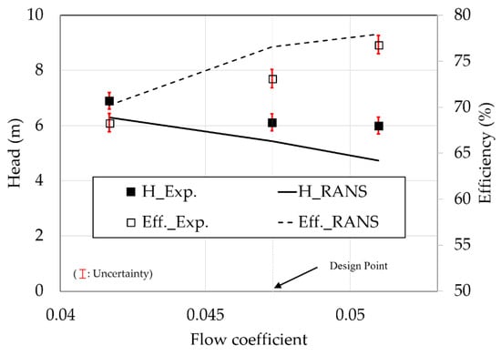 The results of the performance test and the comparison with the RANS analysis are presented in Figure 18 and Table 7. The RANS analysis predicted the higher efficiency and the lower head as much as 3.46% and 0.69 m as compared with the experiment, respectively, at the design point.