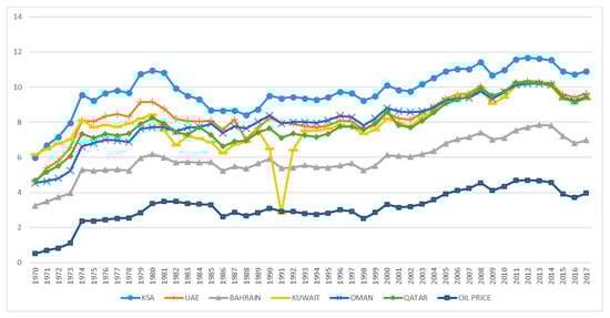 Oil is a primary need of the global economy as a significant energy source for households, industries, and transportation segments. Oil supports macroeconomic performance of oil-dependent countries. Further, oil price (OP) movements affect both oil importer and exporter economies, as increasing oil prices negatively affect the income of the importers by raising the cost of production, and could support the income of oil exporters as well. Mainly, OP changes directly affect the oil-exporting economies because any movement in oil price could have a major effect on the income of oil exporter countries. The literature has corroborated the positive impact of OP on the income and production of the oil-exporting countries and the negative impact on the oil-importing countries [,,,,,,,,,]. In addition, Saari et al. [] discussed that rising OP would have an adverse effect on the income distribution of the oil-importing economy.