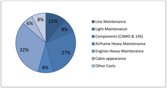 Figure 1 shows that maintenance costs represent approximately 20–25% of an airline’s operating expenses, of which 35–40% are engine related (Figure 2) [2].