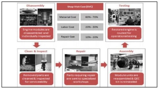 Figure 3 shows in detail the complete cycle of the breakdown of an engine during a shop visit. The most significant costs refer to material cost (60–70% of the total of bill). If LLPs need to be replaced, the cost of material will go up further [2].