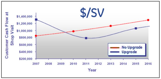 The company to which here we refer works under a PBH contract. Because the contractual terms are sensitive, it cannot be published, but the conclusions are here reported. The cost of a shop visit is similar for each upgrade. Operator’s and manufacturer policies are to replace, during shop visits, damaged parts with new ones of the last compatible upgrade: with time, the engine changes and evolves. This because the pieces, indifferently by upgrade, have the same price and same labor time, and it is convenient to install the last upgrade’s pieces.
