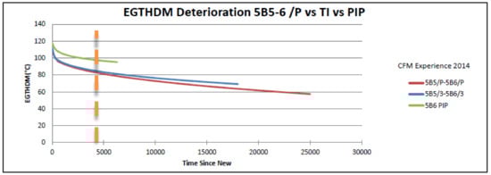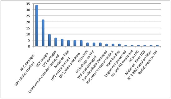 The EGT margin for the control of the efficiency of engine performance is obtained by comparing the measured takeoff EGT and EGT value of the red line (set by the manufacturer on the simulation of full thrust applied in the external temperature conditions “flat rate” [7]. With the progress made in recent years in the field of maintenance, from the introduction of the service bulletin to a general increase in the efficiency of engines (they are approved by a much higher margin now), it is no longer required to disembark for zeroing the engine margin. Over time, the damage to unscheduled events were reduced by over 50% (Figure 9).