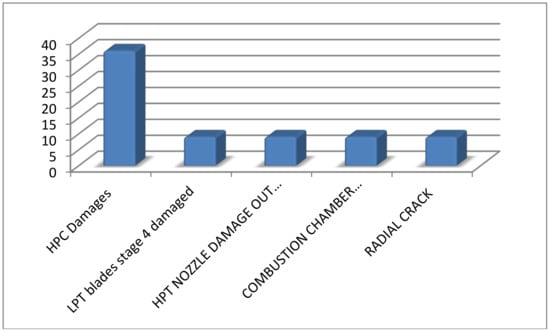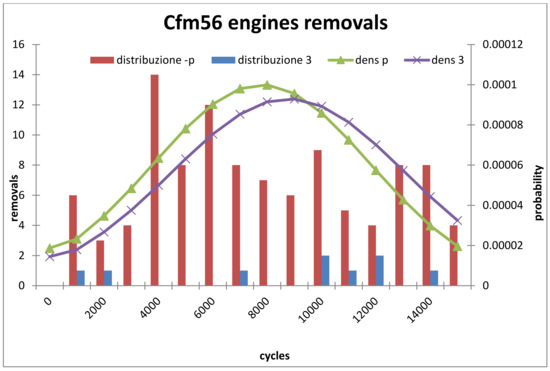 Using the same data derived from engine removal reports (Figure 10), another analysis was also conducted, highlighting the distribution in time (calculated in cycles) of unscheduled damages to the three types of upgrades related to Cfm engines. The 3PIP, as a very recent upgrade, has been excluded from this discussion because since it joined the fleet, there was only one engine which required unscheduled removal.