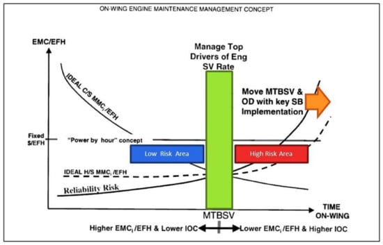 The conditions for paying a fixed maintenance material cost (MMC) or MC per engine flight hour varies with each contract [9]. Ideally, when an operator is on a PBH contract, the probability of engine-related events (operational discrepancies) could be reduced by minimizing the mean time between shop visits. However, when lower MTBSVs are intentionally achieved under a PBH contract, the owner of the engine may end up with a higher maintenance material cost per engine flight hour (MMC/EFH). Therefore, both parties would need to work together to decide on the best time to remove engine (Figure 12). Keeping the engine too long may result in higher cost to the operator if the engine is removed due to an event. It may also result in higher cost to the owner of the engine due to possible higher hot section MMC/EFH.