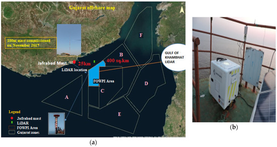 (a) Onshore Mast and offshore LiDAR locations, Gulf of Khambhat; (b) LiDAR Instrument (offshore).