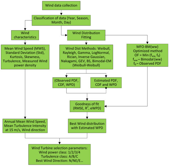 This paper is organized as follows: Section 2 describes the wind characteristics parameters, and wind speed distribution methods used for the analysis and goodness of fitness methods to evaluate the best wind distribution. Subsequently, Section 3 defines the wind site location information for the analysis and optimization method. Further, Section 4 labels the detailed results of wind characteristics analysis and complete examination of ten wind distribution methods with parameters estimated through maximum likelihood (MLM) and goodness of probability density wind. Further, it describes the application of moth flame optimization analysis results with wind power density analysis of selected locations along with detailed research findings of each location.
