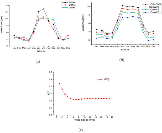 The annual mean wind speed (MWS), standard deviation, maximum wind speed, skew, and kurtosis in the Kayathar region between the years 2014 and 2016 are presented in Table 2 and Figure 5a. The highest mean wind speed of about 6.62 m/s is recorded in the year 2014 with a maximum wind speed of 20.92 m/s for the same year. Further, the skewness factors of the wind speed are observed as a maximum of 0.8086 m/s in the year 2014 and a minimum of 0.5589 m/s in the year 2015. This skewness rate indicates the positive wind distribution with a moderate skew range between 0.5 to 1 [32]. The annual average kurtosis is recorded as −0.3190 and −0.7038 in the year 2014 and 2016 respectively. It specifies the shorter wind distribution and thinner tails than the normal distribution. The wind speed at various altitudes are measured and shown in Figure 5b. It is observed for different ranges such as 10, 30, 60, and 100 mWS. Additionally, the shear analysis power-law coefficient is evaluated and observed as 0.170.