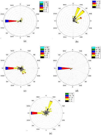 Gulf of Khambhat offshore wind rose: (a) annual; (b) winter; (c) summer; (d) SWM; (e) NEM.