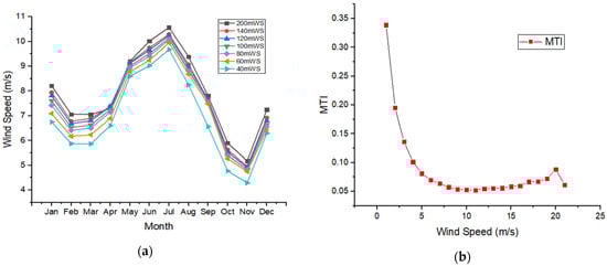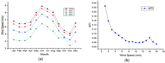 Table 3 illustrates the seasonal wind speed peaks on the South–West monsoon period (SWM) of about 10.03 m/s and maximum seasonal wind speed observed as 18.52 m/s. Comparing the monsoon periods, the North–East monsoon (NEM) fetches a low wind mean speed of 4.5 m/s. The monthly mean wind speed is observed as having a maximum during June of 10.29 m/s and the maximum wind speed during July is 19.81 m/s. The monthly standard deviation is stable from January to March with an average value of 1.8 m/s. Further, it is observed as 3.99, 3.5, and 3.01 m/s for May, July, and October respectively during the peaks in monsoon periods due to seasonal winds. The mean turbulence intensity (MTI) is estimated as a ratio between the standard deviation of the experiential wind speed every 10 min and the mean observed wind speed for the same period. Additionally, the turbulence is higher at a low wind speed as shown in Figure 5c. The defined location, namely the Kayathar wind station, falls on turbulence category ‘B’ (as per International Electrotechnical Commission (IEC) standard) with MTI at 15 m/s of 0.132, i.e., 13.2% (Table 3).