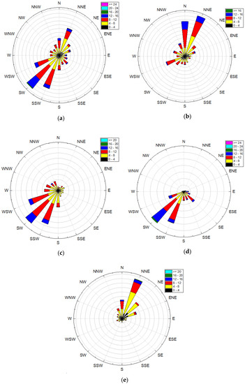 Wind rose plot: (a) annual plot; (b) winter; (c) summer; (d) SWM; (e) NEM.