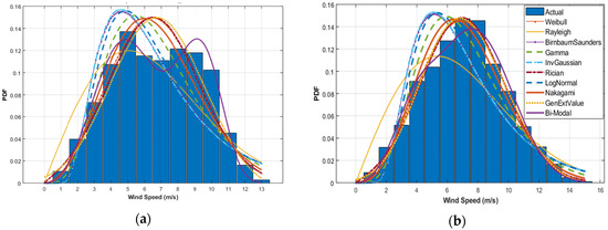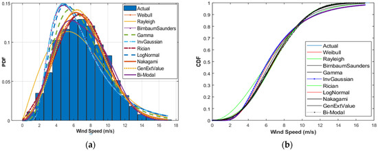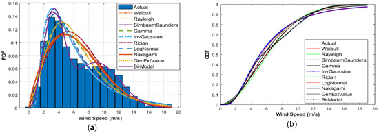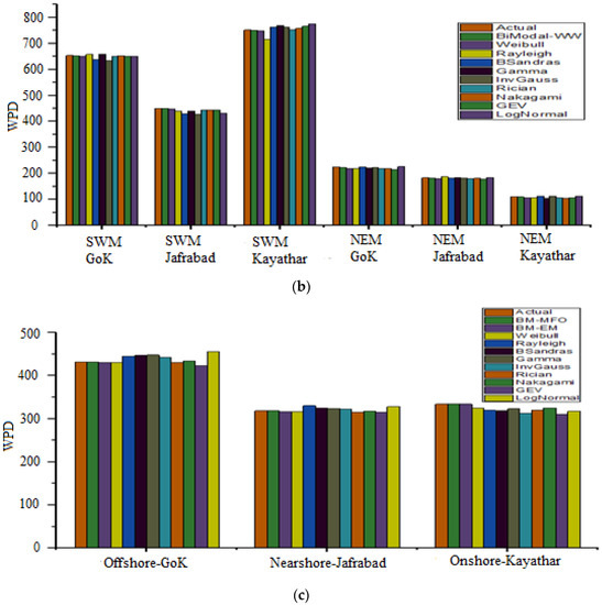 In contradiction to the existing report that supports the Weibull method (as best fit), Fatma et al. [15] examined the usefulness of inverse Weibull (IW), Burr-III extreme value (EV), gamma, inverse gamma (IG), GEV, exponentiated Weibull (EW) and Rayleigh distributions to find the alternative method over Weibull. Further, Morgan et al. [15] assessed the wind speed distribution method at 178 stations in the United States and established that the bimodal Weibull stretches the best results. Additionally, Emilo et al. [16] examined the bimodality method by selecting the number of components in the mixture through two well-known criteria likely Akaike information criterion (AIC) and the Bayesian information criterion (BIC). Finally, the optimal number of Weibull components for maximum likelihood is discovered for the defined patterns with the estimated weight, scale, and shape parameters. The observed outcome displayed that the multi-Weibull models are more suitable. Tian et al. [17] assessed the parameters using bimodal Weibull function (BW), truncated normal Weibull function (NW), gamma–Weibull function (GW), mixture truncated normal function (NN), two parameter Weibull and maximum entropy principle (MEP) method—in which, the MEP and GW methods performed well among others. Ravindra et al. [18] evaluated the Weibull-extreme value distribution, Weibull-lognormal, and GEV-lognormal and stated that the Weibull-GEV model performed fine in unimodal and bimodal wind distributions. Ijjou et al. [19] evaluated Weibull, Rayleigh, gamma, and lognormal method and reported that the Weibull is the best fit.