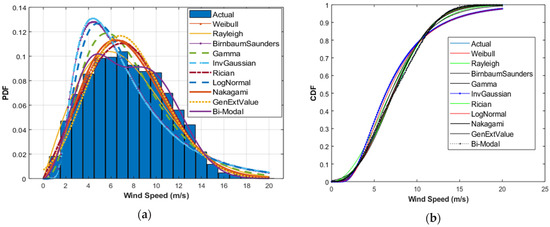 The computation of PDF and CDF wind distribution parameters (σ—scale and x—wind speed) using Rayleigh (RY) are carried out using Equation (A3) and Equation (A4) respectively.