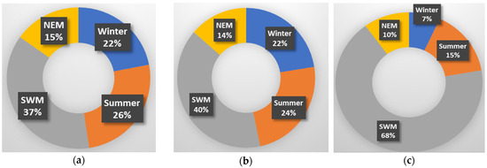 Furthermore, the annual maximum wind speeds hinge on wind direction; the West direction observed a maximum wind speed of 10.26 m/s (38.66%) followed by WSW and WNW, i.e., 11.27% and 7.57% respectively, as shown in Table 4. The second maximum wind generation of NEM in NE wind direction is observed as 6.51%, with a mean wind speed of 4.766 m/s followed by NNE (North–Northern east) of 6.50%. The wind rose plots exposed in Figure 6 indicate the influence of South–West and North–East monsoons. The North–East monsoon influenced the wind direction during October to December, and the West direction shifts to N–NNE (Northern NNE). During SWM periods, (i.e., June–September) wind directions are found to be West and WSW (West southern west). It also represents the main wind direction from the West and ranges between 258.75°–281.25° during the South–West. The winter season experiences NEM winds and influences at the end of the South–West monsoon period. The summer wind rose plot experiences wind from SWM and the wind direction from SE–SSE (Southeast–South Southeast) and Western direction. It indicates that the Kayathar region experiences maximum wind power from the Southwest direction. During low-wind periods from NEM and winter seasons, the wind speed reduced relatively which deteriorate to low wind generation.