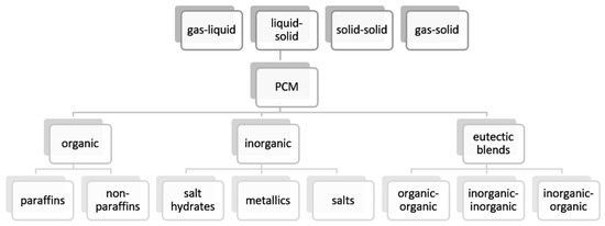 There are three main types of TES, depending on the occurred phenomenon: sensible, latent, and thermochemical [2]. In sensible thermal energy storage (STES), heat is stored by increasing the temperature of a material. In STES, solid materials like rocks, metals, concrete, sand, bricks, and liquid materials like water or ethanol are usually used [3]. Latent heat thermal energy storage (LHTES) comes from isothermal or near isothermal heat absorption and release during the phase change of a material [4]. Materials that store latent heat are called phase change materials (PCMs). The third type of TES is called thermochemical heat storage [2], chemical heat storage [5], or sometimes sorption heat storage [6]. In this type of TES, heat is absorbed/released during reversible endothermic/exothermic chemical reactions or sorption processes [3,5]. Each of the abovementioned techniques provides different possibilities of heat storage, and their properties, advantages, disadvantages, and comparison can be found elsewhere in the literature [2,7,8,9]. PCMs are promising heat storage materials due to their ability to store 5–14 times more heat per unit volume than sensible heat storage materials, and their main advantage is that they absorb and release heat at a nearly constant temperature [10]. PCMs can be classified according to two criteria: chemical composition and type of phase transition [11]. The classification of PCMs depending on chemical composition and type of phase transition based on [10,11,12] is presented in Figure 1.