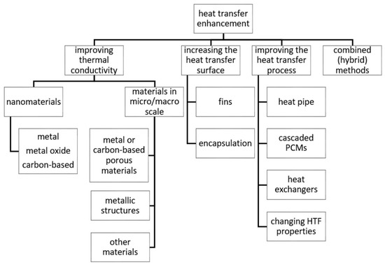 In many cases, it is difficult to assign a heat transfer enhancement method in just one category since some techniques influence at least two parameters. For example, embedding PCMs into high thermal conductivity metal foam leads to both an increase in the effective thermal conductivity of composite material and an increase of the heat transfer surface area. In this paper, embedding PCMs into metal foam is included in improving the heat transfer conductivity group because most research on metal foam focuses only on thermal conductivity enhancement and neglects the fact of an increased heat transfer surface. A similar situation occurs in PCM encapsulation because encapsulated PCMs have a significant heat transfer surface area, and the shell of a capsule can be made of a high thermal conductivity material. Encapsulation is qualified for increasing the heat transfer surface method because shells are not always made of a high thermal conductivity material, but they always have an increased heat transfer surface area. Nevertheless, there is some research on encapsulation, which focuses on improving the thermal conductivity of shell materials, and such research is also discussed.