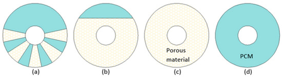A cross-section of LHTES units with (a) porous inserts, (b) partially filled LHTES with metal foam, (c) LHTES with PCM/metal foam composite, (d) LHTES with PCM only [75].