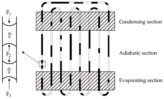 Unlike conventional heat pipes, the conventional pulsating heat pipe (PHP) is wickless and features long-distance transport capability, yet it can handle multiple heat sources or a heat source with a large area. PHP is bent into a close-loop serpentine shape configuration by a long continuous capillary tube, which consists of several straight pipes and bent tubes, and some working fluid. PHP can be divided into three parts: evaporating section, condensing section and adiabatic section, as shown in Figure 1. With the dimension of the capillary tube, the working fluid in the tubes forms a train of randomly sized liquid slugs and vapor bubbles because of surface tension. When the evaporating section receives heat to heat up the working fluid and the condensing section dissipations heat to cool down the working fluid, the net pressure difference between the evaporating section and condensing section pushes the liquid slugs and vapor bubbles toward the other section and results in circulation.