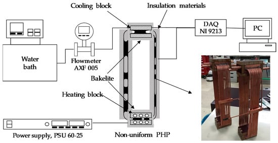 The schematic of the non-uniform experimental apparatus is shown in Figure 2. The experimental setup consists of evaporator, condenser, water bath (YOTEC Instrument Corporation, Taiwan, model B20), direct current power supply, magnetic flowmeter, data acquisition module, and a non-uniform 3D-PHP. DC power supply contains a rated output voltage 60 V with accuracy of ±0.12 V; a rated output current 25 A with accuracy being ±0.075 A; and a maximum output power of 1500 W (Good Will Instrument Corporation, Taiwan, model PSU 60-25). A magnetic flowmeter with accuracy 0.35% and measurable range 0–12.8 L/min is used (Yokogawa Electric Corporation, Japan model AXF-005). Temperature acquisition module is used with a maximum measurement range of ±78 mV, sampling rate of 75 samples/s, and a 24-bit analog to digital converter (National Instrument Corporation, United States, model NI-9213). The evaporators were made of copper block (50 mm × 70 mm × 15 mm), and having six electronic heaters with a total equivalent resistance of 3 Ω. The condenser was made of copper block (50 mm × 70 mm × 15 mm) with volumetric flow rate of 1.25 L/min, and an inlet temperature of 50 °C. The objective of this study is to develop a passive solution for PHP upon high-flux applications. The test conditions mainly refer to the specifications from relevant manufacturers of next generation network switches. Note that the startup temperature is comparatively high, but it is not uncommon. In the meantime, the total input electric power is 811 W subject to an area of 67 mm × 67 mm, and the maximum temperature of system must be controlled below than 110 °C in an ambient temperature of 50 °C.