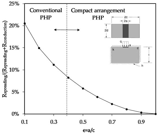 This assumes h = 5000 W/(m2K), k = 400 W/(mK), = 0.333, = 0.1–1.0. The thermal resistance ratio can be calculated using Equation (1), and the results are shown in the Figure 4. The abscissa is relative ratio , which refers to the ratio of heat transport channel width to the total spreading width. The ordinate is relative thermal resistance ratio, which represents the ratio of spreading resistance to spreading resistance plus conduction resistance. For conventional PHPs, the relative width ratio , and the compact arrangement pulsating of this study can attain a value of . The relative thermal resistance ratio of conventional PHP is 8.1% at . In this study, the relative ratio of the proposed PHP is and relative thermal resistance ratio is only 0.6%, meaning a negligible influence of the spreading thermal resistance subject to the present compact arrangement of PHPs.