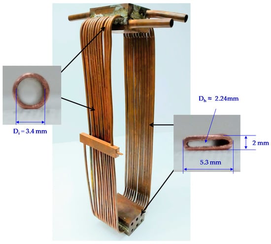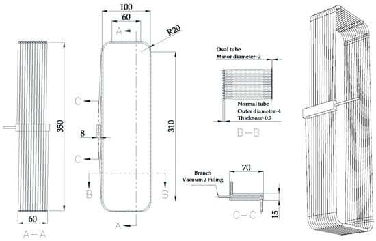 For the present PHP, the outer diameter is 4.0 mm and the inner diameter is 3.4 mm. The heat transport distance between the evaporating section and condensing section is 350 mm, and the distance between two adiabatic sections is 100 mm. The PHP contains 12 turns with a radius of curvature of 20 mm. The tubes of the evaporating section and one side of the adiabatic section were compressed to form an oval configuration with a minor diameter being 2 mm and the hydraulic diameter Dh ≈ 2.24 mm, as shown in Figure 6. The total inner volume is about 95,876 mm3, and methanol is used as the working fluid. Methanol has a lower evaporation temperature and a higher than water. The filling ratio (FR) is 38.7%.