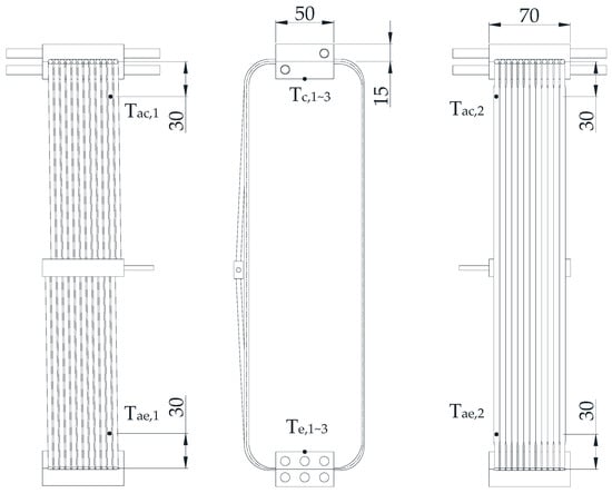 A total of 10 OMEGA T-type thermocouples were used, and the locations of the thermocouples and dimensions of the heating block and cooling block are shown in Figure 7. The lengths of the evaporating section and condensing section of the PHP are both 50 mm, respectively. Thermocouples were denoted as Te,1–Te,3 on heating block surface, Tc,1–Tc,3 on cooling block surface, Tae,1–Tae,2 on the adiabatic section tube surface 30 mm above the evaporating section, Tac,1–Tac,2 on the adiabatic section tube surface 30 mm above the condensing section. Tae,1 and Tac,1 were attached on the same tube of the circle side. Tae,2 and Tac,2 were attached on the same tube of the oval side. The sampling rate of the temperature signal recorder was set to 1.0 s.