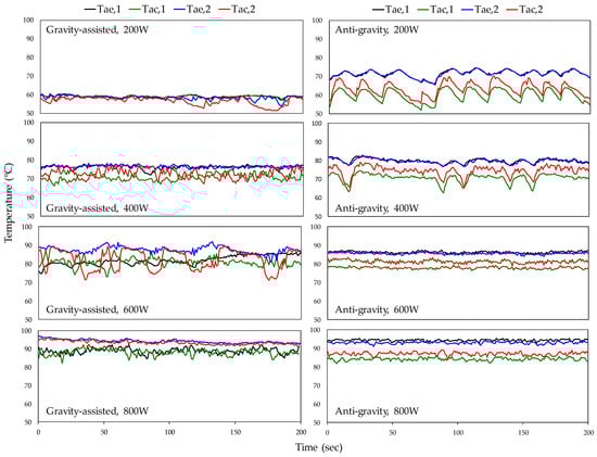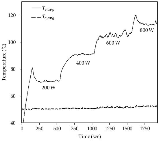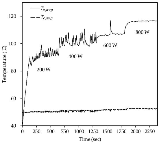 An average temperature variation vs. elapsed time under anti-gravity condition is shown in Figure 9. The experiment input power is increased from 200 W to 800 W which is also in a step of 200 W. Note that the corresponding startup temperature (Te,avg) is about =90 °C while the steady state is reached at about Te,avg = 95 °C. When the input power is less than 400 W, the working fluid of the PHP reveals a lower oscillation frequency, therefore the temperature oscillation can be clearly seen in Figure 9. Once the input power exceeds 600 W, the oscillation frequency of the working fluid also rises to yield a relatively stable Te,avg.