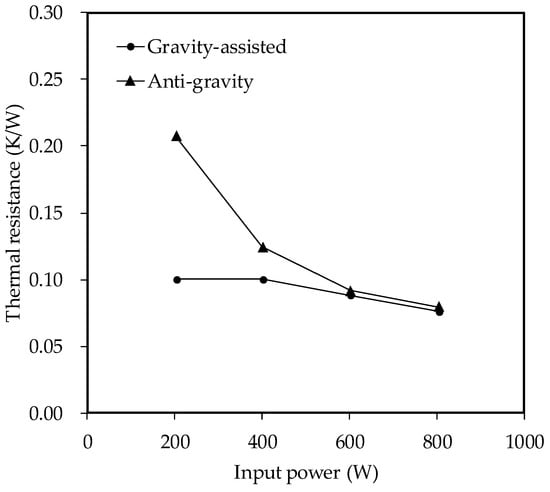 The corresponding average thermal resistance vs. input power is shown in Figure 12. When the input power is less than 400 W, the resultant force of the working fluid is insufficient to drive the working fluid stably, thereby yielding unstable oscillation. Hence, the thermal resistance of the anti-gravity condition is higher than that of the gravity-assisted operation. When input power is greater than 600 W, sufficient driving force is able to facilitate a stable oscillation to form a unitary circulation flow. In this regard, the difference in overall thermal resistance between gravity-assisted and anti-gravity operations is rather small. In fact, at an input power of 600 W, the thermal resistance of gravity-assisted and anti-gravity conditions is 0.0883 K/W and 0.0918 K/W, respectively. When the input power is further raised to 800 W, the thermal resistance of gravity-assisted and anti-gravity conditions is 0.0761 K/W and 0.0796 K/W, respectively. In summary, the difference in thermal resistance between gravity-assisted and anti-gravity operations is less than 10% provided that a unitary circulation flow prevails. The results indicate that the proposed PHP is very suitable for high-flux applications where the inertial force of the working fluid may outweigh the influence of gravity.