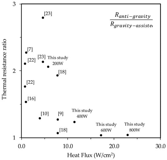 To further demonstrate the superiority of the proposed PHP, performance is in terms of thermal resistance ratio (Ranti-gravity/Rgravity-assisted) and supplied heat flux at the evaporator. The lower thermal resistance ratio indicates that PHP contains better capability to resist the negative influence caused by gravity. The associated performance index is used to compare the proposed PHP with existing literatures [7,9,10,16,18,22,23] is shown in Figure 13. Some further details amid the existing studies and the present one are listed in Table 3. As shown in the figure, the proposed PHP offers the highest heat flux of 22.9 W/cm2 at a supplied power of 800 W while containing the least thermal resistance ratio (Ranti-gravity/Rgravity-assisted) of 1.05 when the input power is 800 W. Apparently, the proposed design is far better than the existing literatures [7,9,10,16,18,22,23], especially at a high supplied power like 600 W or 800 W, yet it still outperforms most of the existing studies even at a moderate power of 400 W.