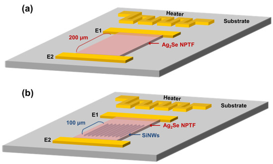 Schematic of a thermoelectric platform comprising a meander line patterned heater, two electrodes (E1, E2), and thermoelectric channels of (a) the Ag2Se nanoparticle thin film (NPTF) alone and (b) the Ag2Se NPTF embedded with silicon nanowires (SiNWs).