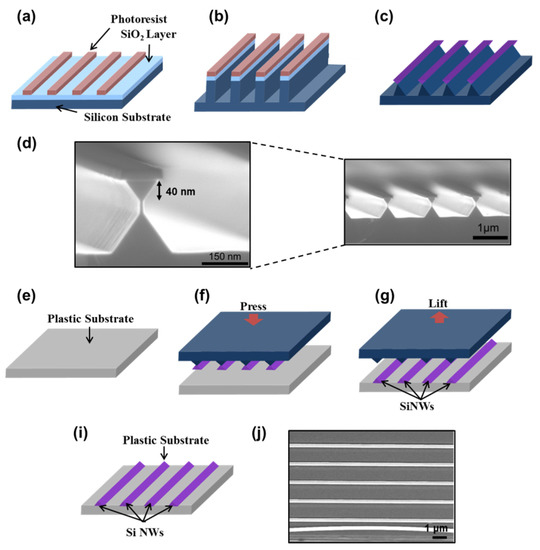 Fabrication process of the SiNWs. (a) Si active lines on an oxide stack. (b) Si trench etching. (c) Crystallographic wet etching. (d) SEM images of fabricated SiNWs. (e–i) transfer process of SiNWs on plastic substrate. (j) SEM image of transferred SiNWs.