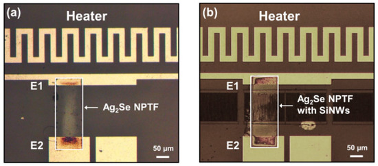 Figure 4 displays optical images of the Ag2Se NPTF alone (a) and the Ag2Se NPTF embedded with SiNWs (b), and shows that the SiNWs were well covered with the Ag2Se NPTF but that they maintained a distance from the electrodes E1 and E2. In this study, the temperature difference (ΔT) caused by joule heating of the heater is defined as the difference in temperature between the hot electrode E1 and cold electrode E2, as the temperatures of those parts of the NPTF in contact with the electrodes were the same as those of the corresponding electrodes. By contrast, thermal energy caused by the heater was propagated through thermal conduction of the thermoelectric channel (Qthermoelectric channel) and thermal radiation (Qradiation) and the substrate (Qsubstrate). In the case without any thermoelectric channel, the ΔT was caused by Qradiation and Qsubstrate, whereas in the case with a thermoelectric channel, the ΔT is caused by Qradiation, Qsubstrate and Qthermoelectric channel. Thus, the Qthermoelectric channel was determined by the difference between the temperatures of E2 for the cases with and without the thermoelectric channel.