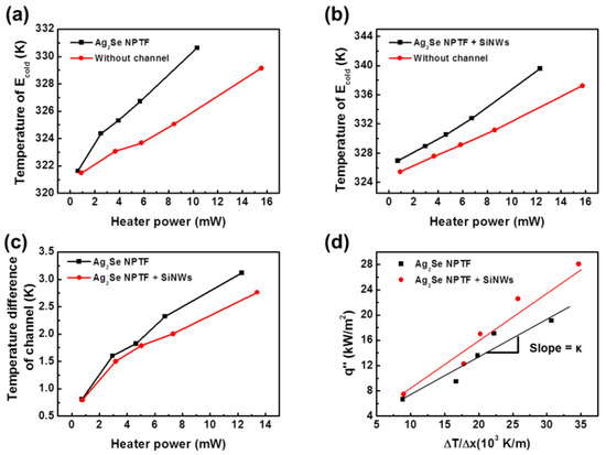 To measure the thermal conductivities of the Ag2Se NPTF alone and the Ag2Se NPTF embedded with SiNWs, the temperatures of E2 were measured as a function of heater power, as depicted in Figure 5a,b, respectively. Herein, the heater power has the proportional relationship with the temperatures of E1 because a large amount of heat is transferred to E1 as the heater power increases. As previously mentioned, the difference between the temperatures of E2 for the cases with and without the thermoelectric channel was attributed to the Qthermoelectric channel. The temperature difference was induced by the Qthermoelectric channel for the Ag2Se NPTF alone and the Ag2Se NPTF embedded with SiNWs as a function of heater power, as depicted in Figure 5c, indicating that thermal energy was more quickly transferred in the Ag2Se NPTF embedded with SiNWs than in the Ag2Se NPTF alone. The thermal conductivity of the thermoelectric channel was calculated based on the heat conduction law known as Fourier’s law. The lateral heat conduction of thermoelectric channel was calculated by the equation as follows [25]:
