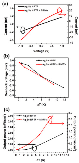 (a) Current–voltage characteristics, (b) Seebeck voltage, and (c) output power as a function of temperature difference for the Ag2Se NPTF alone and the Ag2Se NPTF embedded with SiNWs.