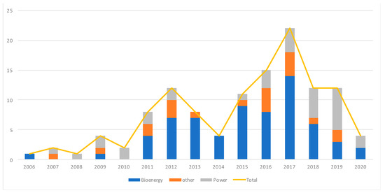 In term of temporal horizon, two papers [23,24] out of 102 case studies modelled the change in the past through a survey and monitoring program. Specifically, Hou et al. conducted a monitoring project and a questionnaire survey on biogas consumption and leakage and digestate quantities for the two villages in China [23]. Data in the study were obtained in 2010 to calculate the GHG balance and in 2014 to evaluate changes in rural household biogas systems [23]. Meanwhile, Moore et al. carried out an analysis of various scenarios with two control variables: Crop management techniques and source of nutrients for sugarcane crops to examine the effects of replacing chemical fertilizers with vinasse and filter cake during ethanol production [24]. These scenarios were developed for the period of 2011–2015, and the changes were quantified based on a substitution approach, through screening governmental documents and literature [24].