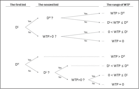 Several sets of two bids, and (), prepared by the focus group survey, are utilized. For example, if five sets were created, all respondents would be divided into five groups. Let WTP be for brevity. Within each group, the same set of bids is presented, with roughly half of respondents first asked whether they intend to pay . If they answer “yes,” they are further asked whether they intend to pay . Responding “yes” to this question will imply , responding “no” will mean . If they answer “no” to the payment of , they can be divided into = 0 responses and responses by additionally asking whether they intend to pay a little.