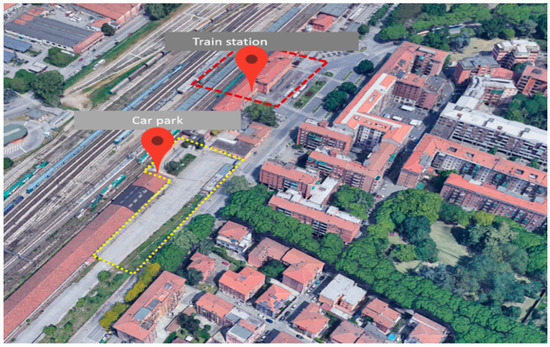 The location of this study is the parking lot situated adjacent to the train station. The area is marked by an intensive one-modal exchange for the presence of the railway station, bus stops and terminals, bike parking and taxi stops, as shown in Figure 2. It is expected that a new parking lot will soon be located adjacent to the railway station and will consist of 115 parking spaces, 5 of which will be equipped for charging EVs. The total area occupied will be 4300 m2.
