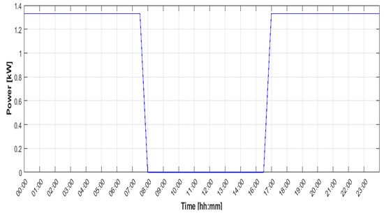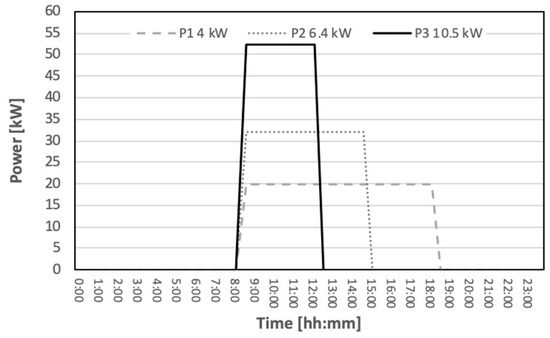 Lighting for the parking lot is optimized by the provision of 18 lampposts, which run along two main panels across the entire length of the parking lot. Each lamp’s strength is 74 W, which aggregates to a total of 1.3 kW. For the most unfavorable case, December 21st was chosen because it is the shortest day of the year. It was hypothesized as a continuous operation that goes from 4:30 p.m. at 8:00 a.m. The resulting power curve is presented in Figure 3.