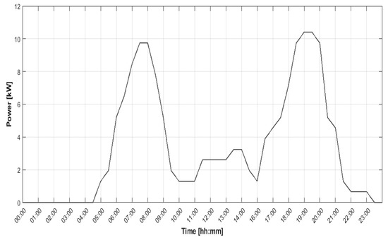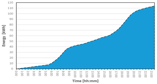 The relative energy consumption is shown in Figure 10. Appreciably, greater energy absorption occurs between 7.00 a.m. and 10.00 a.m. and between 5.00 p.m. and 9.00 p.m., and as a result of which, two peaks of power are derived. The daily total energy absorbed is approximately 114 kWh.