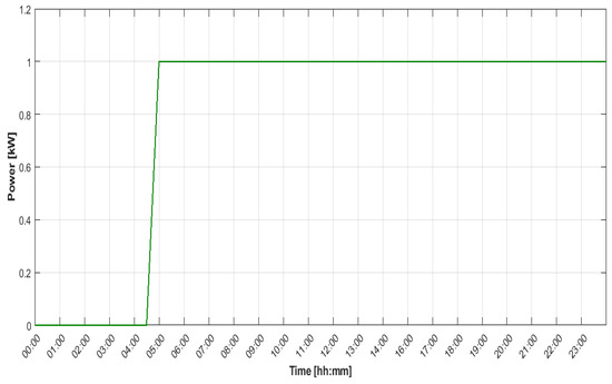 The parking area has a technical room available for use by parking operators. The main load that can be hypothesized is the air conditioning system, which is attested on a power of about 800 W. In order to factor in accessory loads, a constant absorption of 1000 W is assumed over the entire period of service of the car park. Figure 6 indicates the expected trend.