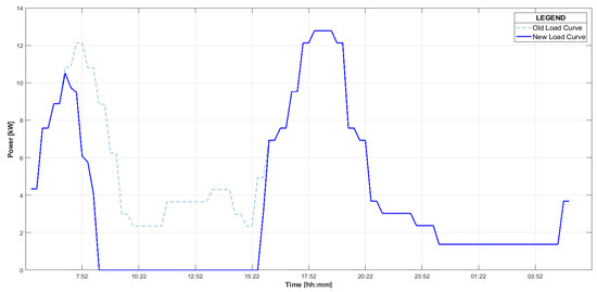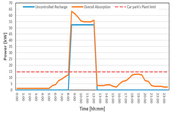 As seen so far, the car park under examination is equipped with a series of electrical loads, which, overall, indicates power absorption similar to that shown in Figure 9. The red dotted line represents the maximum power limit that can be absorbed by the car park’s electrical system, which stands at around 14 kW. Figure 9 shows the basic load of the car park. Now, assuming that power absorbed by electric cars is added, it will derive a load curve that is similar to that in Figure 7, which assumed the simultaneous recharge of five EVs during the first peak. However, this assumption presents a rather burdensome situation, because it requires a considerable amount of energy to be absorbed from the grid over an extensive period. This is a classic example of an uncontrolled charging without the implementation of any smart charging feature.