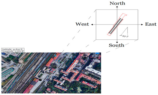 However, the problem does not arise (or, is mitigated) if instead, the energy used came from a renewable source. Therefore, concurrently with the development and widespread use of the EVs, it is important to launch initiatives that aim at a greater diffusion of renewable energy sources [52,53]. Following from this, a photovoltaic power plant will be designed in this section in order to provide the car park’s load demand. As already described, the reference car park is the parking lot adjacent to the railway station. In this car park, the installation of three EVSEs with V2G technology was planned. Geographically, the site of interest has an azimuth of 30° towards the west, as shown in Figure 11. The optimal tilt angle of the panels was instead set at 30°.