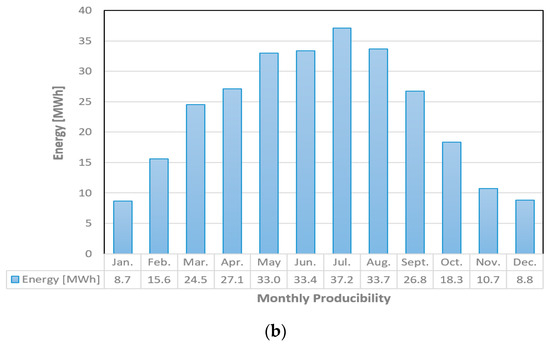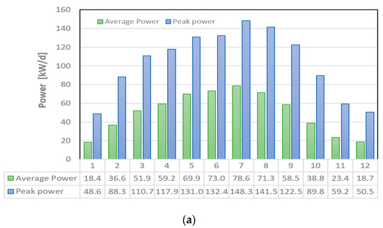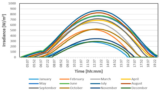 The average daily solar radiation of this site, characteristic for each month, was obtained from [52]. From these data, the graph depicted in Figure 12 was derived.