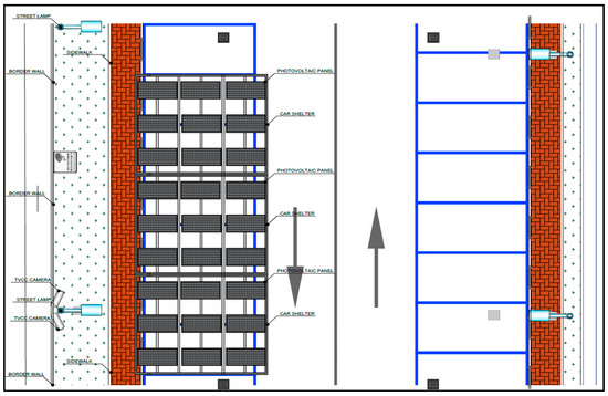 The project involves the installation of specific support structures for the PV modules to allow an optimal exploitation of the available surface. The proposed structure is illustrated in Figure 13. It is a modular solution that simultaneously occupies two parking spaces and can also hold up to 9 PV panels at a time. The steel structure guarantees the best balance between lightness and strength of the structure. Evidently, the presence of the support rails, due to their shadowing, implies an inversely proportional impact on the power gain of the double-sided technology. For the present work, a gain in power of 5% will be cautiously considered.
